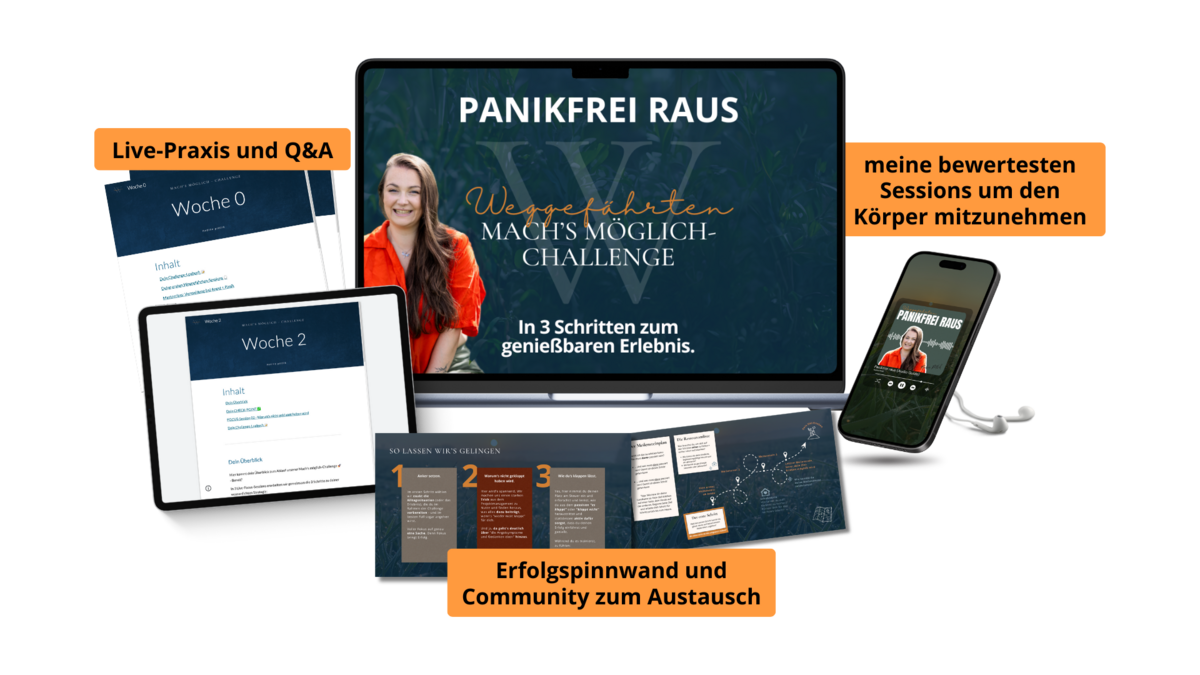 Und weil ich nach meiner eigenen durchlebten Angst + Panik und der Begleitung meiner Weggefährten genau weiß, wie wichtig es ist, echten Halt und Zuversicht zu fühlen, habe ich die Mach's möglich-Challenge für dich gestaltet. Sie ist dein erster Schritt in ein neues Kapitel – ein Kapitel, das du ab heute selbst bestimmst.